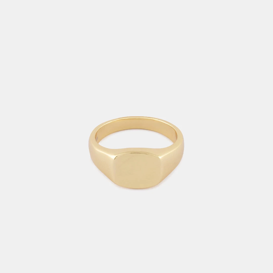 The ring has a soft square face which curves into shapely shoulders that wrap around the finger into a thick band making it a strong and sturdy every day ring. The ring is finished with a 14KT Gold Plating. It is the perfect ring for someone looking for a timeless piece of jewellery that they can wear again and again.