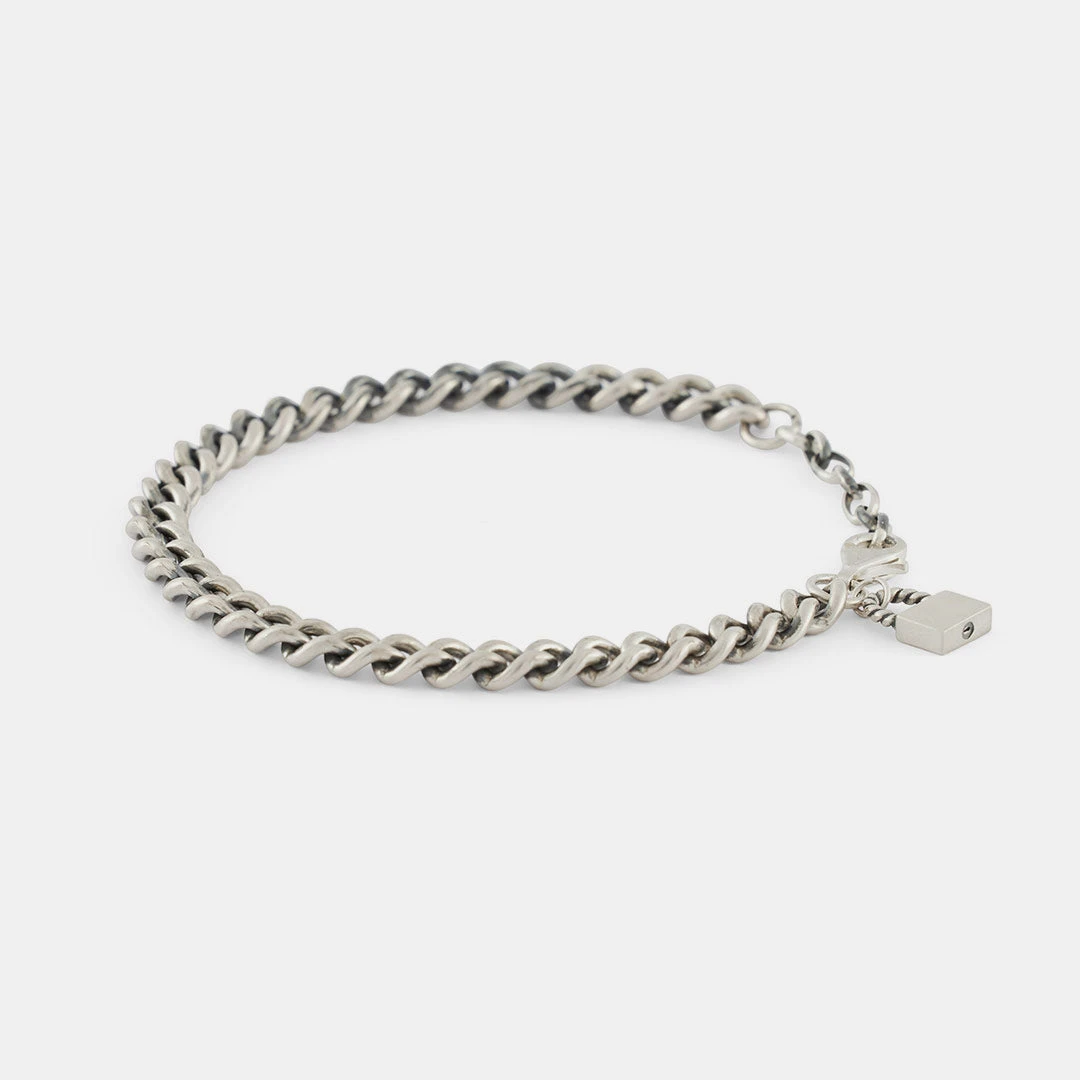 The bracelet features a 6mm rounded curb chain with an oxidised effect for an aged, vintage look. Hanging from the chain is a small padlock with rope detailing that symbolises security, love & commitment. The curb chain is 17cm long and has a 3cm adjustor chain so can be resized up to 20cm.