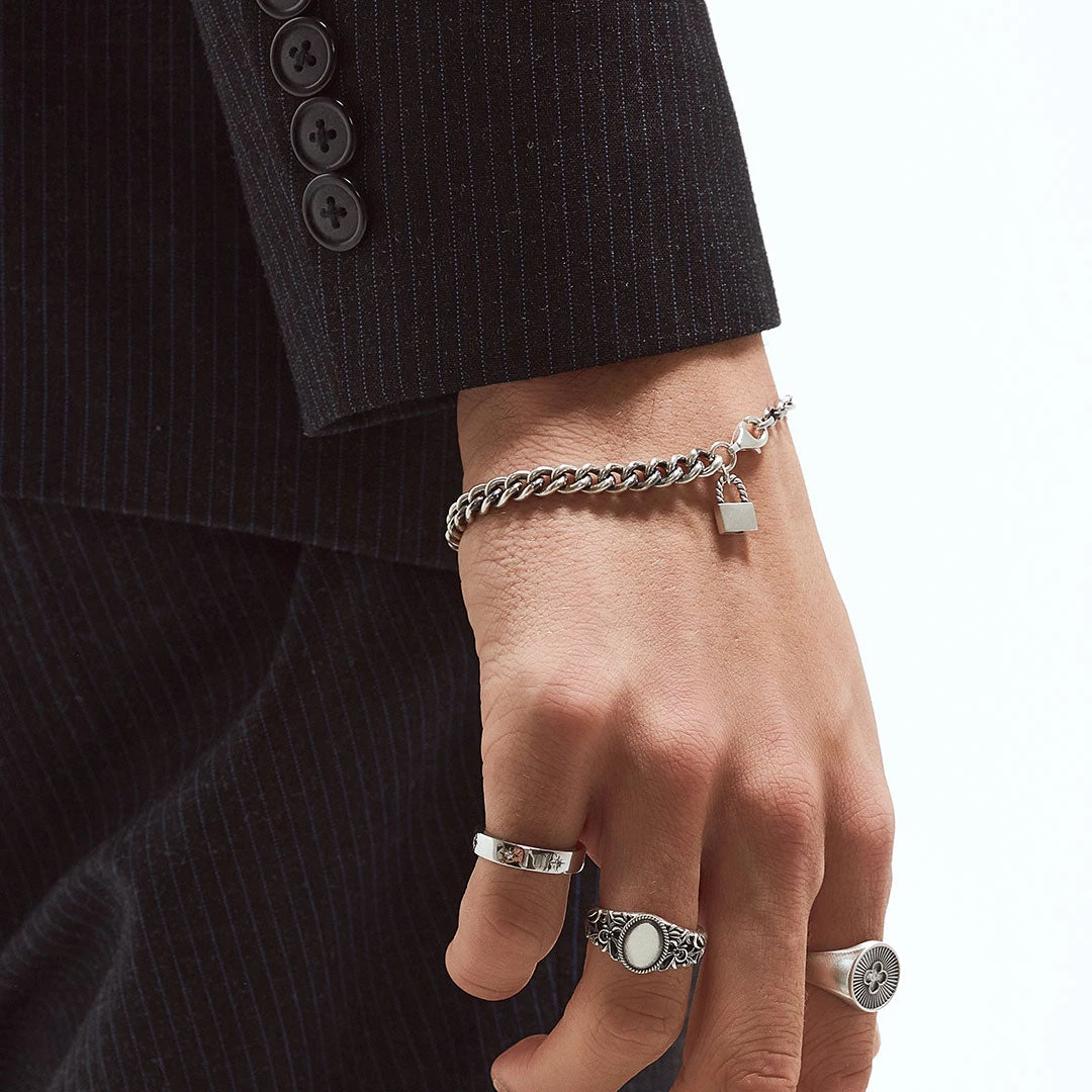 The Silver Padlock Bracelet consists of a chunky rounded curb chain with a small padlock pendant. Made from 925 Sterling Silver and is hallmarked by the Goldsmiths’ Company Assay Office verifying its quality.