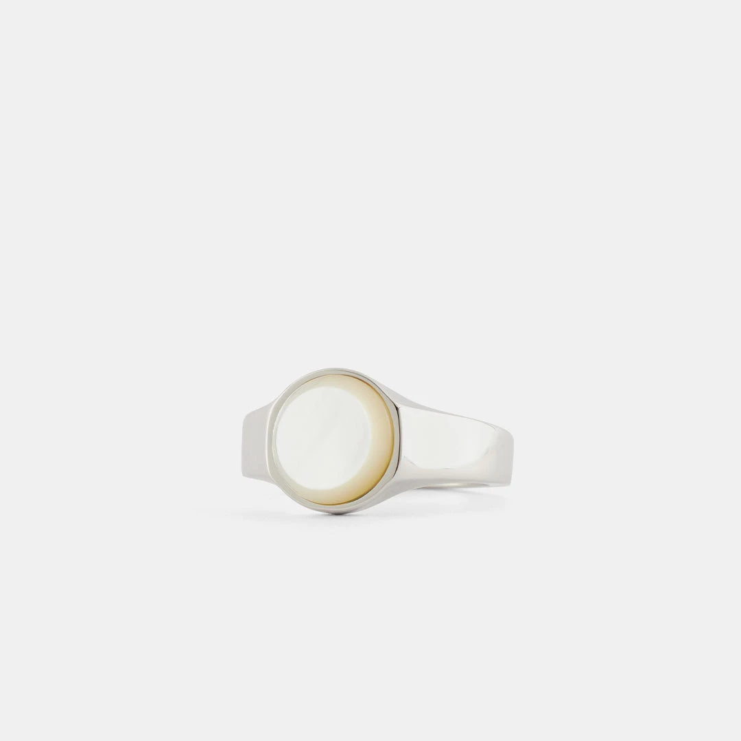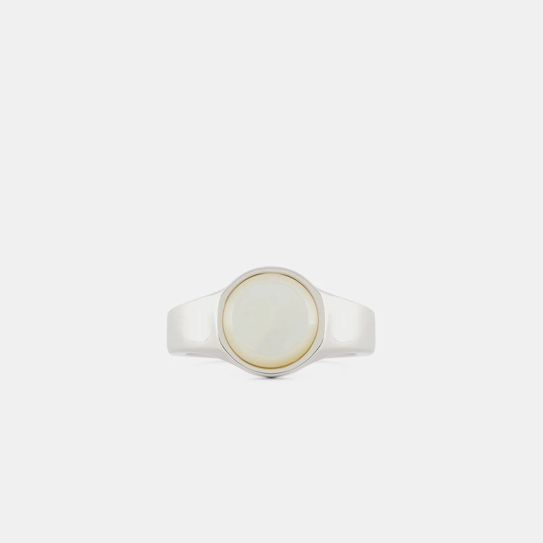 The Mother of Pearl Ring is a classic signet ring design with a circular face. The centre of the design is the ethereal, natural Mother of Pearl stone, with bevelled edges. Mother of Pearl is a relaxing, soothing and calming natural gemstone, providing gentle healing properties and relieving stress. The ring is finished in a premium Rhodium Silver plating that won’t discolour or age. Rhodium plating is a premium Silver coloured plating that gives the jewellery a polished, reflective finish. As it is part of the platinum metal family, it is harder than gold so provides jewellery with a durable surface which resists tarnish.