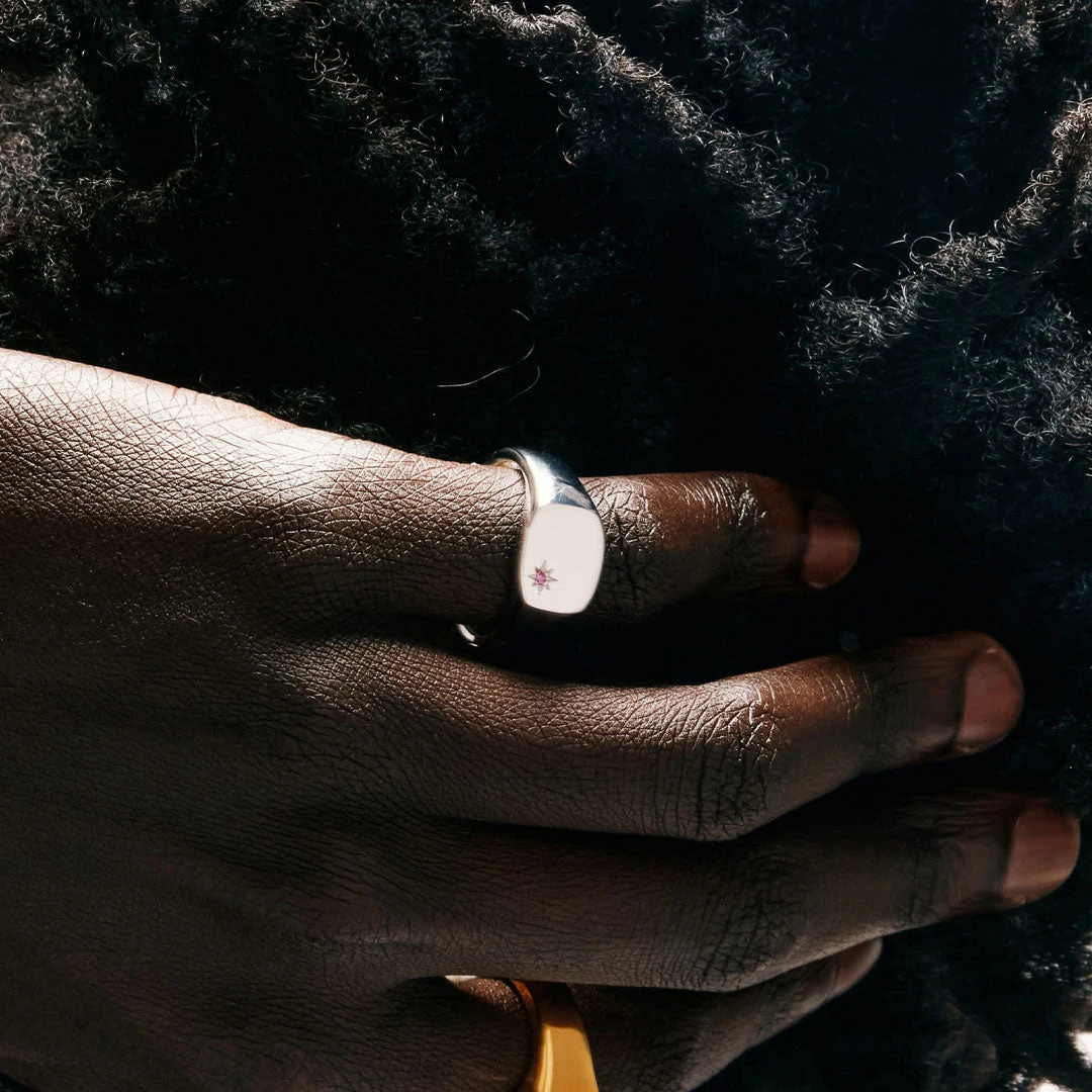 The ring has a soft square face which curves into shapely shoulders that wrap around the finger into a thick band making it a strong and sturdy every day ring. The bottom corner of the ring face has an engraved star setting which holds a natural, rich red Ruby gemstone. Ruby is the birthstone for July birthdays and is traditionally given as a gift for 40th Wedding Anniversaries.