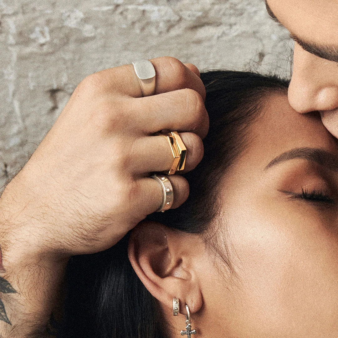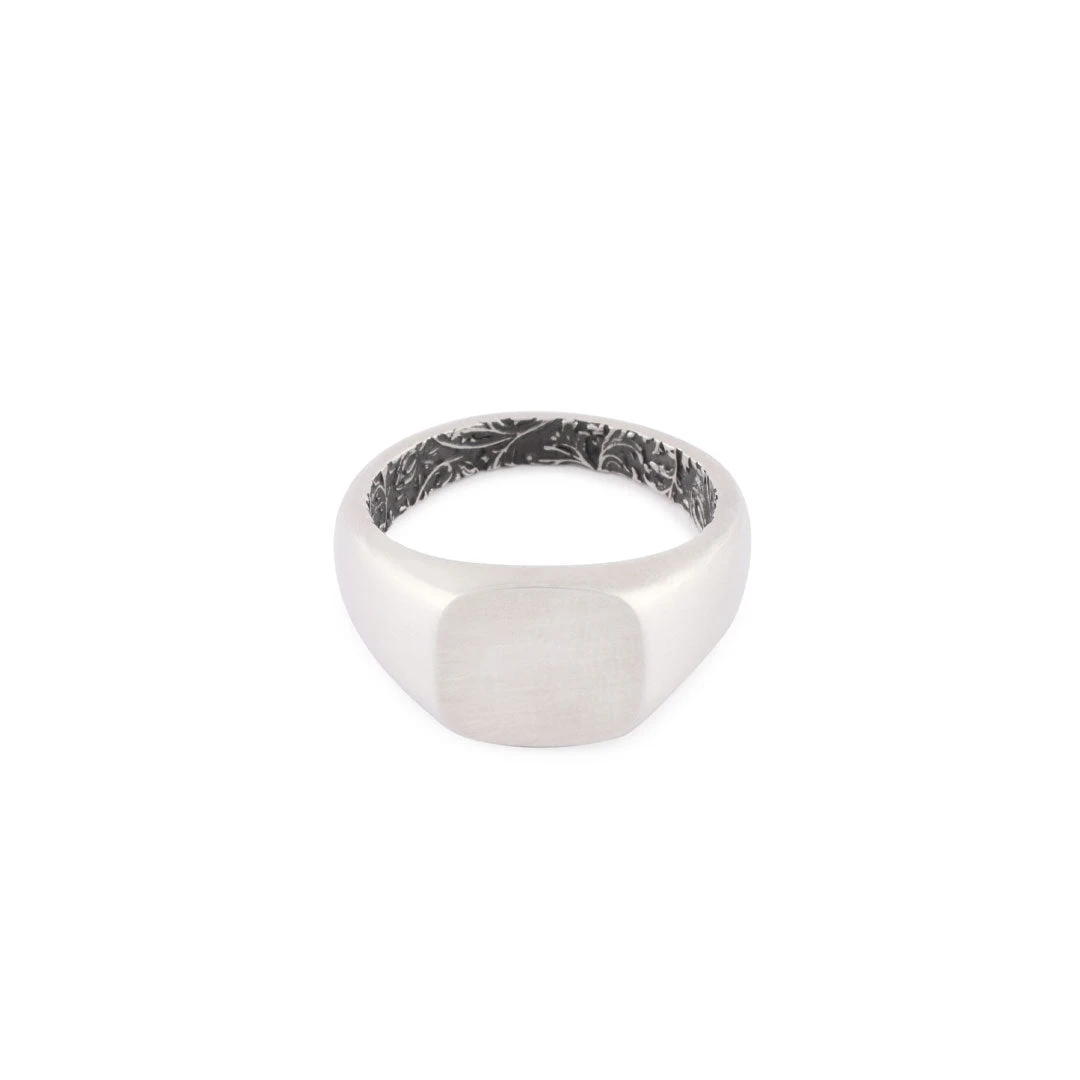 The Secret Garden Ring features a sleek, polished exterior that gives it a smooth and minimalist look. However, hidden on the inside, it reveals an intricate damask floral pattern. This pattern is concealed when the ring is worn, symbolising hidden secrets or inner complexity. The contrast between the plain outer surface and the detailed interior creates a unique design perfect for wearing alone or with another ring such as the Silver St Christopher Ring.