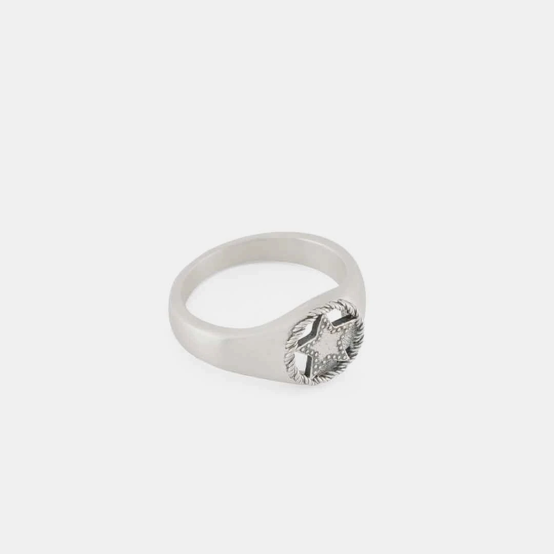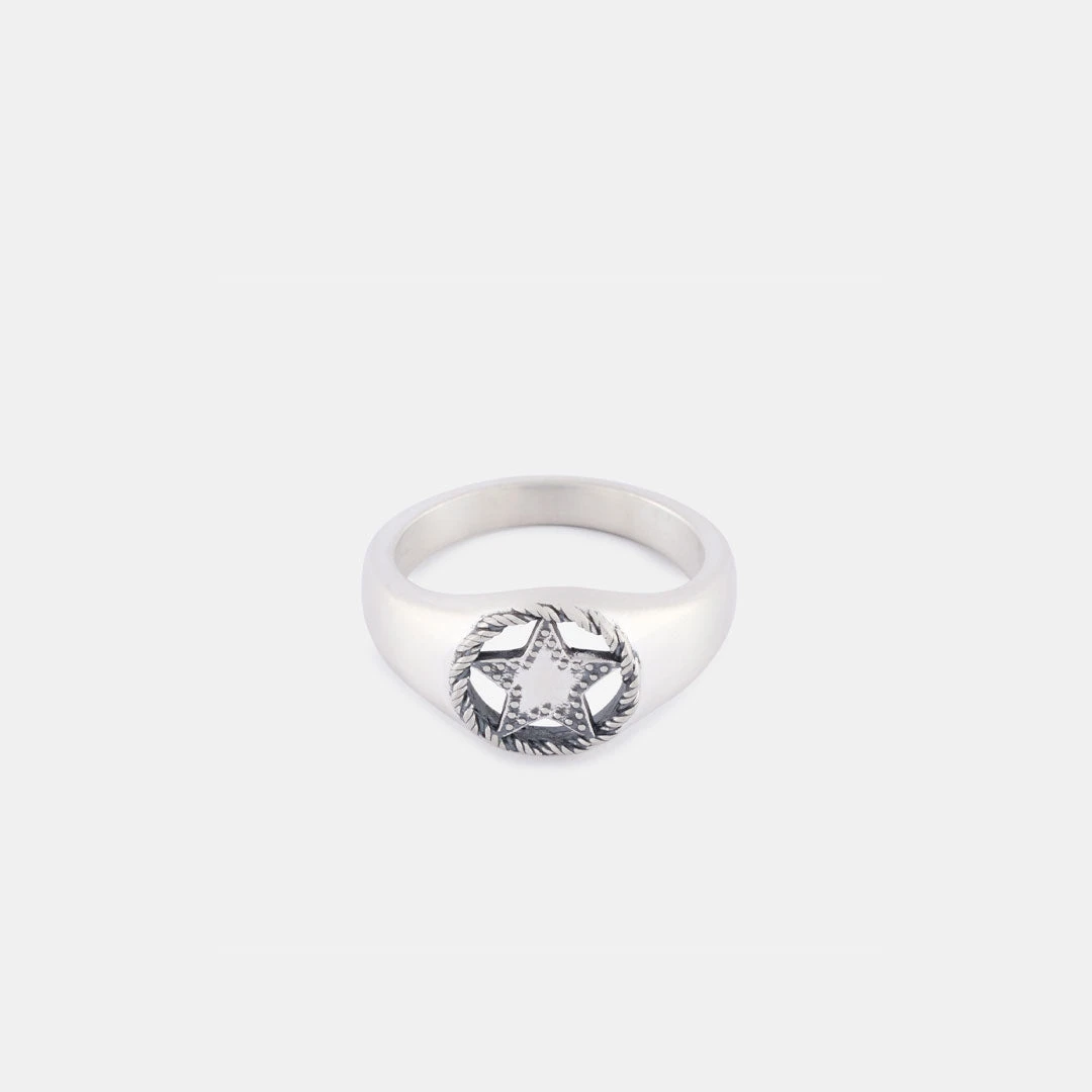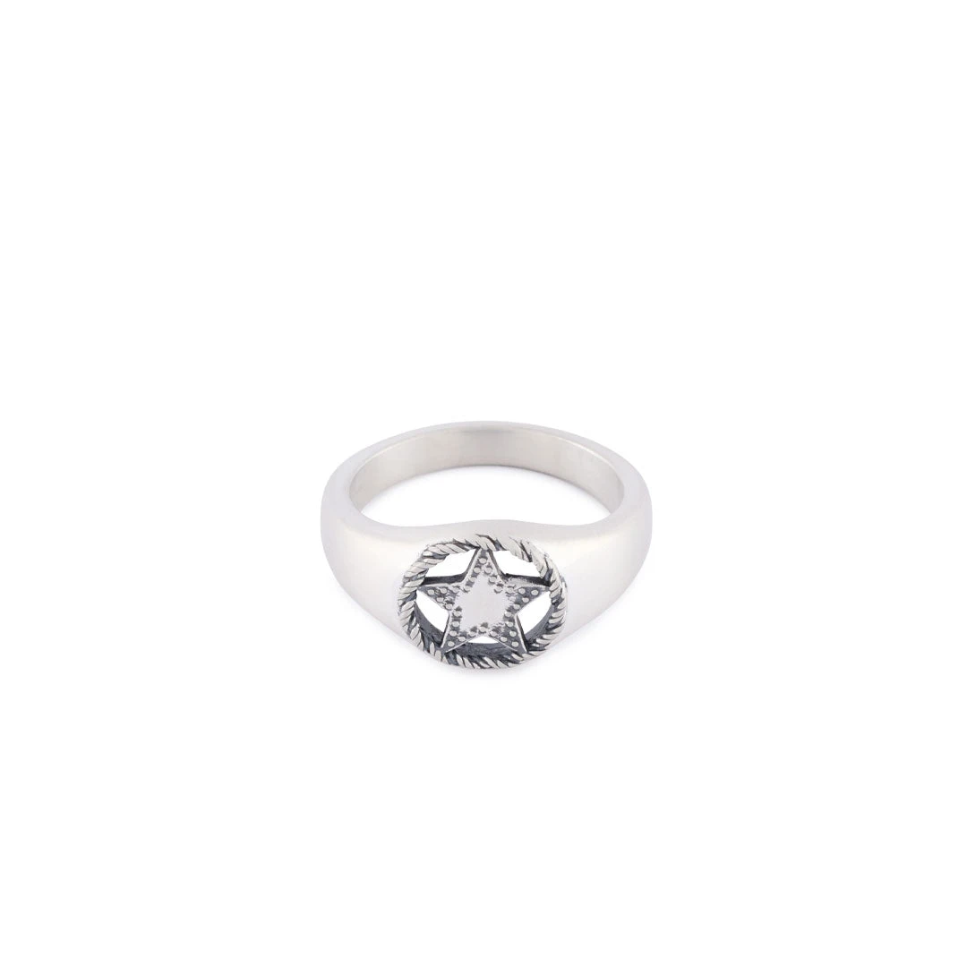 The Sheriff Ring features a round shaped face with a rope border and a cut out star design inspired by a Sheriff’s badge. The round face of this ring is a classic silhouette making it perfect to wear alongside other pieces such as the Silver Lasso Ring for a contrast of shapes and detailing.