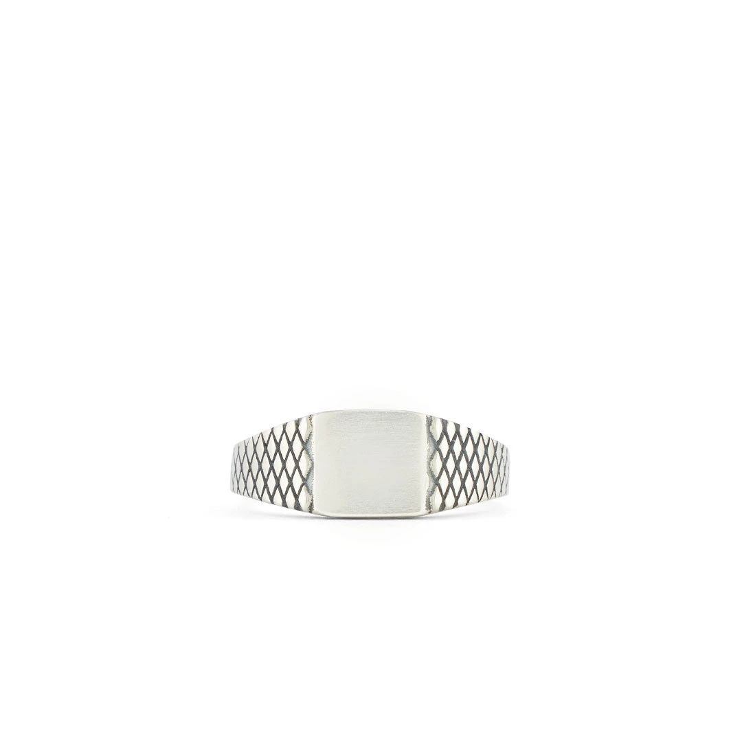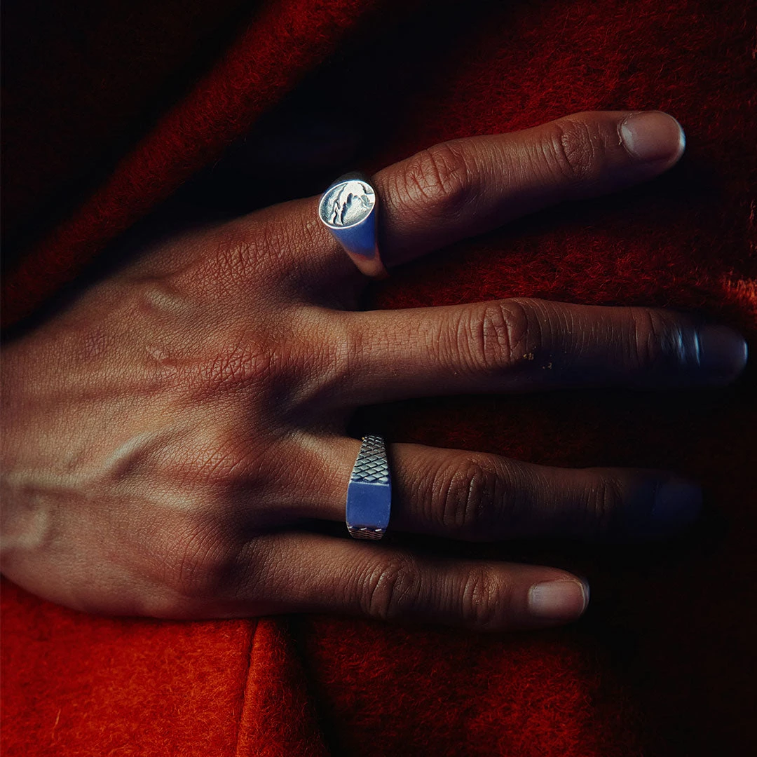 The ring has a blank face with a polished finish giving full attention to the detail on the shoulders and band. The detail on the shoulders is taken from the tracks found on the moon left by the Lunar Roving vehicle’s tyres. The inside of the ring is smooth for a comfortable fit & it has an oxidised finish to highlight the intricacy of the design.